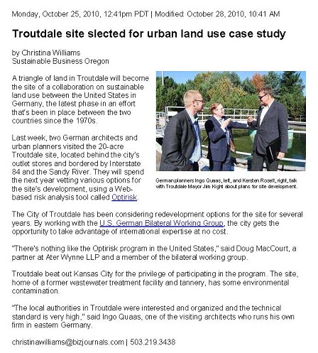 The Smart Growth Project Scorecard will be applied in the City of Chemnitz in the German Federal State of Saxony. Translation of the Scorecard into German was finished in January 2011. In February, the City of Chemnitz will chose a project to which the Scorecard will be applied. The adaptation of the Scorecard to the situation in Chemnitz, a shrinking city, will also provide guidance as to how similar situations in the U.S. can be addressed. For further information, contact Uwe Ferber or Tamar Shapiro. Information regarding the application of the PLACES approach in Germany Discussions for collaboration started with the City of Biedenkopf on November 25, 2010 when a first meeting with two representatives of the City of Biedenkopf took place. Next, decision makers of Biedenkopf will be informed about the intended project. A first workshop is planned for June 2011. For further information, contact Verle Hansen, Philippe Schmidt, or Alena Bleicher. Information regarding the application of the SINBRA approach in Indianapolis, Indiana The SINBRA sustainability assessment toolkit will be applied to the Monon Acres site in Indianapolis, Indiana to establish which kind of land use would be the best for sustainable urban development. Early in January 2011, the assessment tool will be discussed in detail between the partners. An assessment panel of local experts will be assembled and informed about the procedure by May 2011. At the same time, the Indianapolis partners are looking for a second site that is suitable for the assessment procedure. For further information, contact Christopher Harrell or Wolfgang Müller. Information regarding the application of the Optirisk® e-tool in Troutdale, Oregon The Optirisk® e-tool will be applied in the City of Troutdale, Oregon where the city plans to redevelop a brownfield site formerly occupied by a municipal sewage plant and a rendering plant. A first site visit and kick-off meeting with the Mayor of Troutdale took place in October 2010, to evaluate the suitability of the site for the application of Optirisk®. The site was found suitable and now Integrated Site Development Concepts for optimal re-use of this brownfield site will be developed. Further information about Optirisk® can be found at www.optirisk.de For further information, contact Doug McCourt or Anika Homuth. Click here for a PDF of the Troutdale article shown below