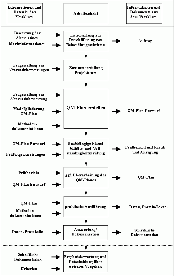 Die unterste Ebene der Systemdokumentation stellen die Arbeitsmethoden dar, die für die Ausführung der Arbeiten zur Verfügung stehen. Dies entspricht z.B. im Bereich von Laboratorien die Methodensammlung der einsetzbaren Analysenmethoden. Für ein konkretes Projekt wird durch den Verantwortlichen die geeignete Arbeitsmethode (z.B. Analysemethode) ausgewählt, die der projektspezifischen Aufgabenstellung genügt. In Bezug auf den Bereich der Altlastenbearbeitung besteht im Regelfall ein Altlastenprojekt aus einer Abfolge von Arbeitsschritten. Die hiermit verbundenen Tätigkeiten befassen sich mit der Erhebung von Daten in der Umwelt. Alle Tätigkeiten folgen dem Grundschema aus Planung, Ausführung, Bewertung und Ergebnisdokumentation. Ein erster Schritt zur Entwicklung des komplexen Qualitätsmanagementsystems "Altlastenbearbeitung" kann daher beispielhaft ein prozessorientierter Verfahrensablauf sein, der eine konkrete "technische" Aufgabenstellung hat und parallel auch Entwicklungsmöglichkeiten für übergeordnete Regelungen des QM (z.B. Qualitätspolitik, Struktur eines QMS) beinhaltet. Auf der Basis der Erfahrungen in der BMBF - U.S. EPA Zusammenarbeit in Phase I wurde der Prozess "Technische Erprobung von Sanierungsverfahren" mit der damit verbundenen Datenerhebungen skizziert (Steffens et al., 1998). Der Ablauf einer entsprechenden Verfahrensanweisung ist nachfolgend dargestellt.